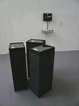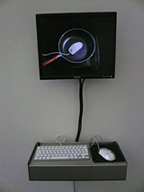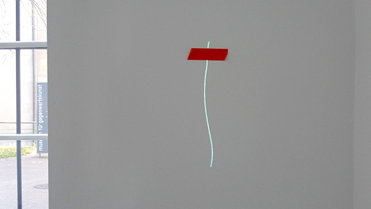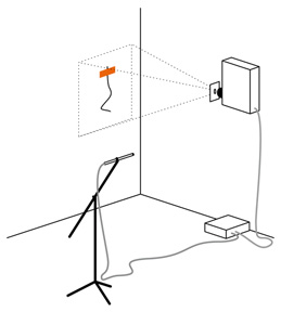 ![]() ![]() The image of a thread stuck to the wall with tape is projected on to another wall. A microphone stands in front of it. The tones and sounds picked up by the microphone move the thread, making it vibrate gently, twitch or even curl up completely, depending on the intensity. |