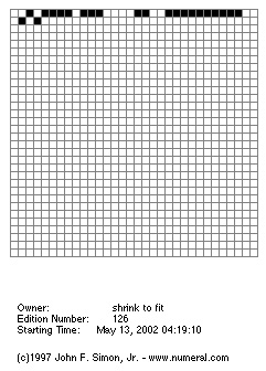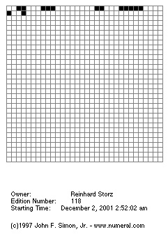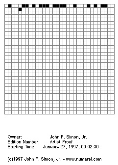 ![]() ![]() ![]() On 27 January 1997 at 09:42:30 the graphics program consisting of 32 x 32 white panels began. At the top left, the Java applet started a countdown, as black panels started to join together, moving to the right from field to field at a pace that halved with every panel. The exponentially declining speed with which the black panels move to the right and downwards communicates a perception of time that is not that of human beings. In the artist’s estimation, it will take 16 months to play out all of the 4.3 million combinations of white and black panels on the top line. To complete the second line, it will take about 6 billion years. The title of the work, “every Icon”, plays on the fact that over the period that it will take for all the panels to turn black, to which it is almost impossible to attach a figure, all of the image combinations, both identifiable and meaningless, will appear that it is possible to construct on a fremework of 1024 panels.